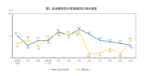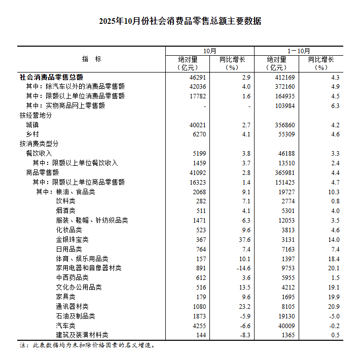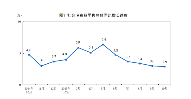 国家统计局:10月份社会消费品零售总额增长2.9%